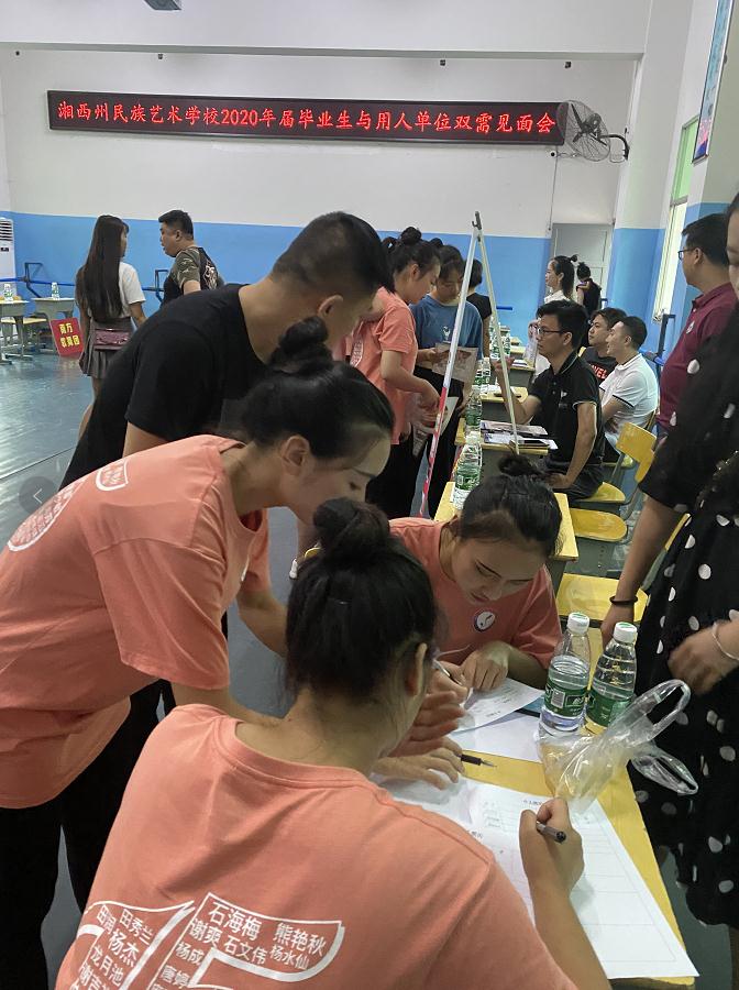 来到现场的用人单位代表,有深圳欢乐谷、广东南方歌舞团、重庆市民族歌舞团、湖北咸宁市歌舞团、海南省民族歌舞团、湘潭市艺术剧院、广东惠州歌舞剧院有限责任公司、湖南省歌舞剧院、重庆秀山金凤凰培训中心、广东东莞吉致艺术学校、广东东莞飞乐艺术学校、广东东莞天艺艺术学校、株洲市戏剧传承中心、厦门小白鹭艺术学校、深圳市开元盛世文化传播有限公司、湖南省大众传媒学院、湖南省艺术职业学院、广东东莞星起舞舞蹈学校、广东中山火炬歌舞团、甘肃省演艺集团有限责任公司、青岛三利集团艺术团有限公司、湘西烟雨凤凰旅游演艺有限公司、湖南省民族歌舞团、中国铁路广州局集团有限公司、韶山润泽东方文化产业发展有限公司、湘西现代职业教育集团、重庆市黔江区明星艺术培训学校、湘西八县市艺术团、重庆市黔江区职业教育中心、吉首市民族歌舞团、边城印象、湘西智和商业管理有限公司、湘西州歌舞团、广东惠州歌舞剧院有限责任公司、湖南省歌舞剧院、深圳锦绣中华。(今天还有一些用人单位受疫情影响不能来到现场,州艺校以传送视频的方式进行线上招聘。)