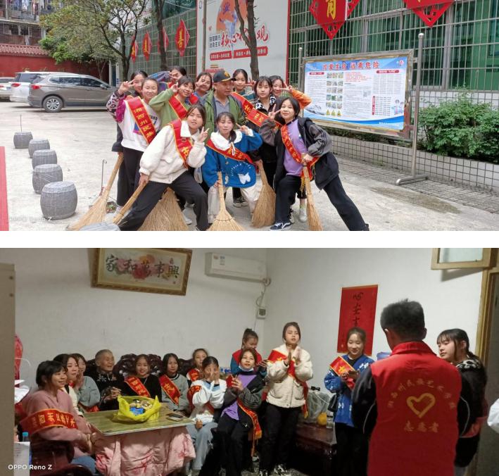 活动形式:由州艺校师生志愿者组织约24名师生志愿者积极清扫退休教师宿舍楼道,给曹喜等退休老教师们一个洁净的环境。怀着对老一辈艺术家的爱戴和敬意,前往吉首光明新村东山路62号罗时娥教授家中,探望84岁高龄的罗老师,送上慰问品、献上歌舞、诗词朗诵等节目,和罗老师聊天,表达了对老一辈艺术家的关爱和敬意,送给老人们春天般的温暖。