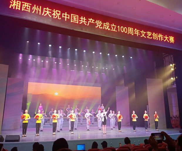 州民族艺术学校王祥老师和州群艺馆的毛胜娟老师和州歌舞团的谭宁老师一起创作的革命历史题材舞剧《红》,以建立过中国三大苏区之一的湘鄂西湘鄂川黔革命根据地红色主题为大背景,这个构思不仅用歌舞来推动叙事,更通过娴熟的电影语言将一个关于历史,关于音乐,关于爱情的故事娓娓道来。将个人的情感与整个红色湘西的历史命运相结合,将家国情怀融合在一起,把个人的情感升华为民族命运,在色调上以红、蓝相结合,红色代表革命,代表激情,代表青春,代表热血;蓝色代表战争,代表思念,代表压抑,代表回忆,两种不一样的色调穿插整个作品,将观众情绪带入其中。作品通过各种艺术手法形式来表达我们对革命先烈的崇敬之情,充分展现了党的光辉历程、巨大变化和无数革命英雄的担当,体现了新时代中国青年、湘西青年的使命与初心。让现场观众在八分钟之内,享受到一场精彩的舞台艺术,激发了观众的时代使命感!