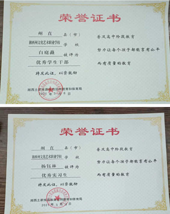 1.2021年湘西州民族艺术学校参加的全省职业艺术院校技能大赛,我校选手分别获得一等奖、二等奖,这是艺术教育行业全面检测学校教学质量的普测。经过评比充分明确了我校教学育人的质量,彰显了州艺校在全省的地位,及专业的成就。