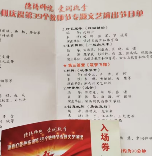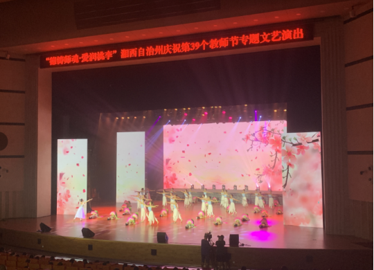 “尊师重教是一个民族强大的表现。”9月8日,湘西州庆祝第39个教师节专题文艺演出在武陵山大剧院隆重开演,州民族艺术学校50多名师生共同参与演出了群舞《桃李芬芳》。通过舞蹈的形式来展现了我校学生尊师重道,师生间团结有爱,关系和谐融洽。如果没有老师对文明的继承和传播以及创造性的劳动,就不可能培育出建设祖国的栋梁之才。由此可见,民族的复兴与教育事业息息相关,而教育事业中教师是功不可没的。