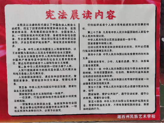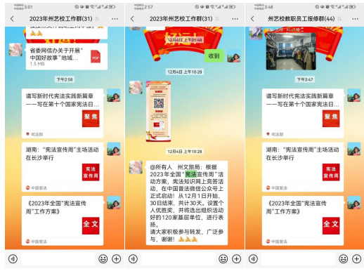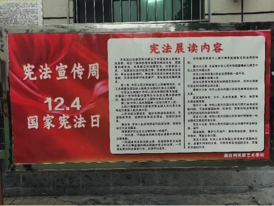 “12·4”是国家宪法日,为增强学生的宪法意识,提高学生的法治素养,我校结合实际情况,12月1日-8日,开展了一系列“宪法宣传周”活动,取得了良好的效果,让广大师生都充分感受到法律的重要性,使法治精神深入人心。让学生更加深入地了解宪法,树立法治观念,增强法律意识,为建设法治校园打下坚实的基础。现将我校开展活动情况汇报如下: 为了切实开展好这次宣传教育活动,校领导高度重视“12.4”全国法制宣传日活动,对“12.4”宣传活动做了精心组织、全面安排。 弘扬法治精神,知法、守法、护法是每个公民的崇高义务。我校历来重视对师生法制精神的培养,此次法制宣传活动是在全校范围内营造更为浓厚的法律氛围,进一步增强广大师生的法制观念和法律意识,促进了依法治校,依法执教。具体活动内容有:1、充分利用宣传栏、微信群等形式营造浓郁的教育氛围,进行了宣传普及。