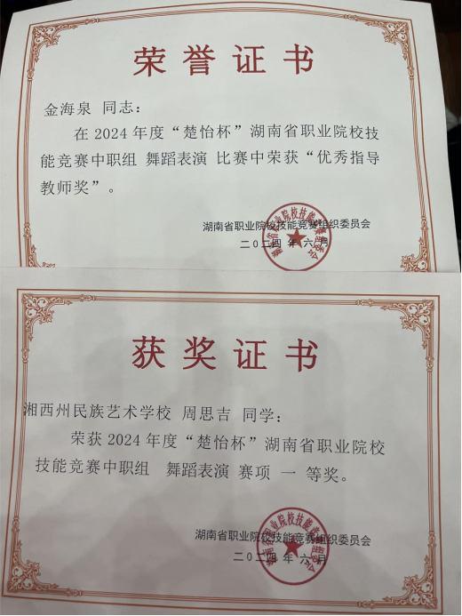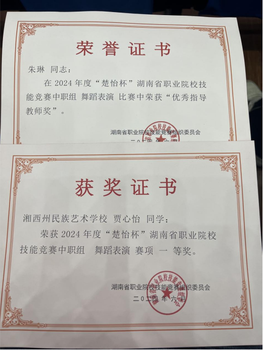 (通讯员 杨朝辉)在由湖南省教育厅、人社厅主办,湖南湘江新区管委会等单位联合主办的2024 年度“楚怡杯”湖南省职业院校技能竞赛中,湘西州民族艺术学校选送的两位选手在舞蹈表演个人赛中双双喜获一等奖!贾心怡同学荣获舞蹈表演个人赛一等奖(指导老师:朱琳)