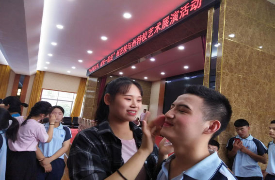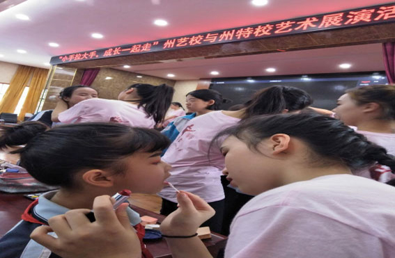 28日下午1:00,州艺校志愿者所乘坐的大巴准时到达州特校,在宽敞明亮的演播厅里两校老师和演员们互助互爱,欢快地做着演出前走台、化妆、音响、服装等准备工作。