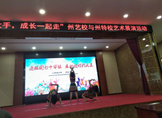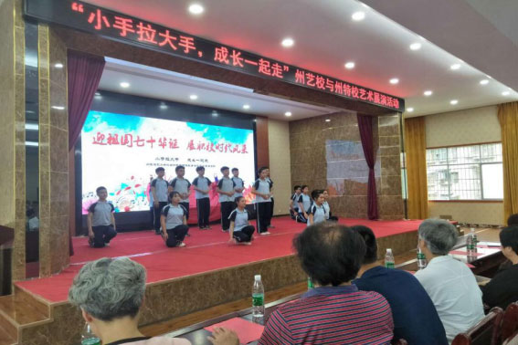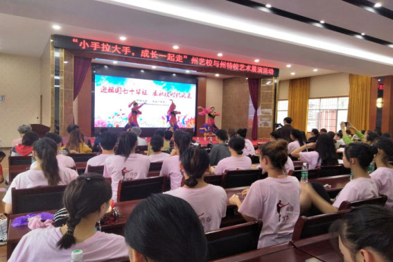 2019年5月28日下午,州民族艺术学校“爱心”文化志愿者们本着慰问特殊儿童,传递爱心的宗旨,在州民族特殊教育学校演播厅举行了“迎祖国七十华诞,展职校风采-小手拉大手,成长一起走”的慰问演出联谊活动,本次活动以习近平新时代中国特色社会主义思想和党的十九大精神为指导,全面贯彻党的教育方针,围绕立德树人的根本任务,以结对帮扶的形式大力开展美丽校园共建,与州民族特殊学校相互学习,共同进步。