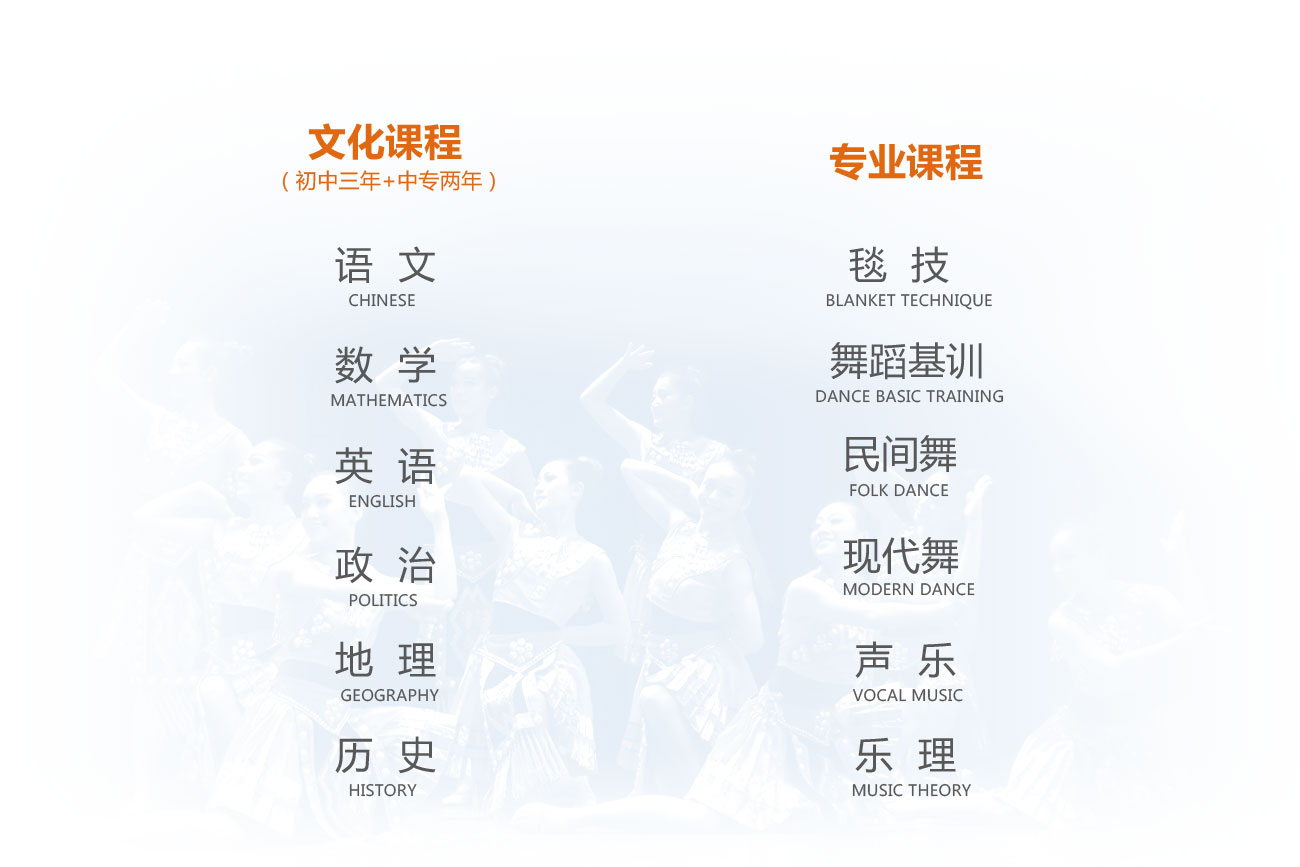 2、报考条件:五年制中专招考条件:年满11—14岁,身高150cm以上,五官端正,身材比例匀称,节奏感与协调性好的12—16岁小学毕业生及应初中往届毕业生。三年制中专及3+2大专招考条件:年满14岁—18岁,女身高160cm以上,男身高170cm以上,五官端正,身材比例匀称,节奏感,协调性好的初中应往届毕业生。