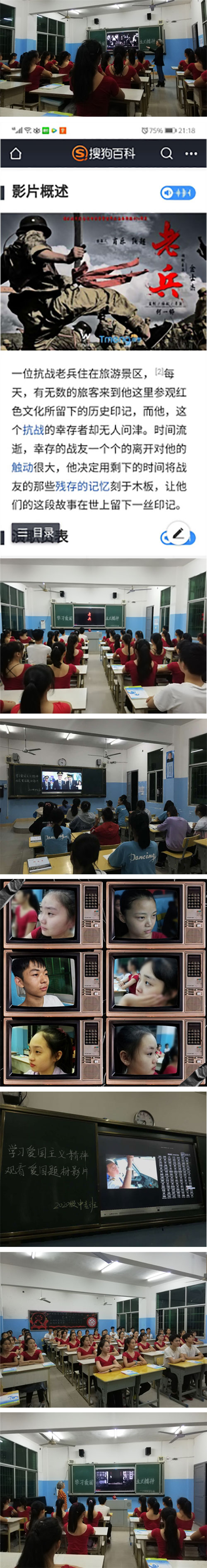 在学校领导的精心组织下,我们组织观看了两部爱国影片,分别是《老兵》、《中国机长》。通过观看影片,学生认识到了革命先烈在革命过程中,失去了亲人,付出了鲜血和生命,换来了革命的胜利,换来了今天幸福的生活,我们应该倍加珍惜,用行动去表现,好好学习,发奋努力,将来为国争光,报效祖国。学生也认识到落后就要挨打,正是清政府的腐败无能,伟大的祖国才倍受欺凌,也只有努力学习,加倍努力,国家富强,才能不被人欺。看完电影学生认识到了感恩,今天的幸福生活是如何得来,一切并不是理所当然,无数革命先烈用鲜血和生命换来了革命的胜利,在革命年代,许多少年儿童也加入了革命的队伍,与他们的生活相比,我们可以说是活在天上,但这样的生活有些同学还不知道珍惜,不知道利用大好时光好好学习,通过对比,学生知道了生活来之不易,懂得了感恩,知道了以后应该怎样做,做一个什么样的人。