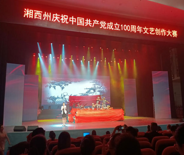 州民族艺术学校王祥老师和州群艺馆的毛胜娟老师和州歌舞团的谭宁老师一起创作的革命历史题材舞剧《红》,以建立过中国三大苏区之一的湘鄂西湘鄂川黔革命根据地红色主题为大背景,这个构思不仅用歌舞来推动叙事,更通过娴熟的电影语言将一个关于历史,关于音乐,关于爱情的故事娓娓道来。将个人的情感与整个红色湘西的历史命运相结合,将家国情怀融合在一起,把个人的情感升华为民族命运,在色调上以红、蓝相结合,红色代表革命,代表激情,代表青春,代表热血;蓝色代表战争,代表思念,代表压抑,代表回忆,两种不一样的色调穿插整个作品,将观众情绪带入其中。作品通过各种艺术手法形式来表达我们对革命先烈的崇敬之情,充分展现了党的光辉历程、巨大变化和无数革命英雄的担当,体现了新时代中国青年、湘西青年的使命与初心。让现场观众在八分钟之内,享受到一场精彩的舞台艺术,激发了观众的时代使命感!