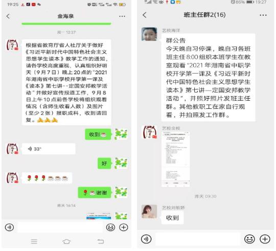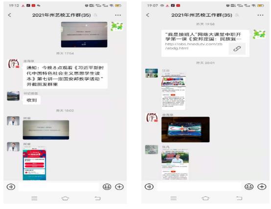 9月7日19:30,第一周值周领导胡小兰校长带着值班老师杨朝辉在18级、19级、20级、21级,四个年级的教室巡视,确认直播设备正常开通。20:00,同学们和班主任欢聚在宽敞明亮的教室里认真地观看了一堂别开生面的直播课---由国防科技大学纪建强副教授带来的开学第一课《安邦定国:民族复兴的坚强保障》,在讨论环节,同学们积极发言,写下了观后感。正如21级新生唐秋玲同学写下的“我们就是接班人,对祖国做贡献不一定要等长大后,现在的我们也可以做到。---国强才能国安。生在中国是多么幸福和幸运。”李畅同学写下了“没有中国共产党的领导,就没有我们如今强大的中国,维护国家安全,人人有责”,每一位同学都认真书写和递交了观后感,这一份份观后感就是新时代中职生的一个个承诺。